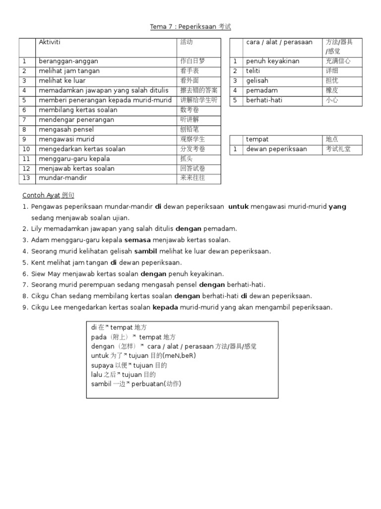 Human translations with examples. Seorang murid kelihatan gelisah sambil melihat ke luar dewan peperiksaan. Kata ganda bersajakberima ialah perkataan yang ditambah mengalami perubahan bunyi.